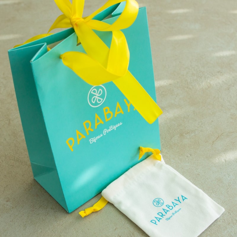 Un joli sac Parabaya couleur turquoise avec ruban jaune soleil + un pochon doux en coton, pour un effet wahou garanti dès l’ouverture !