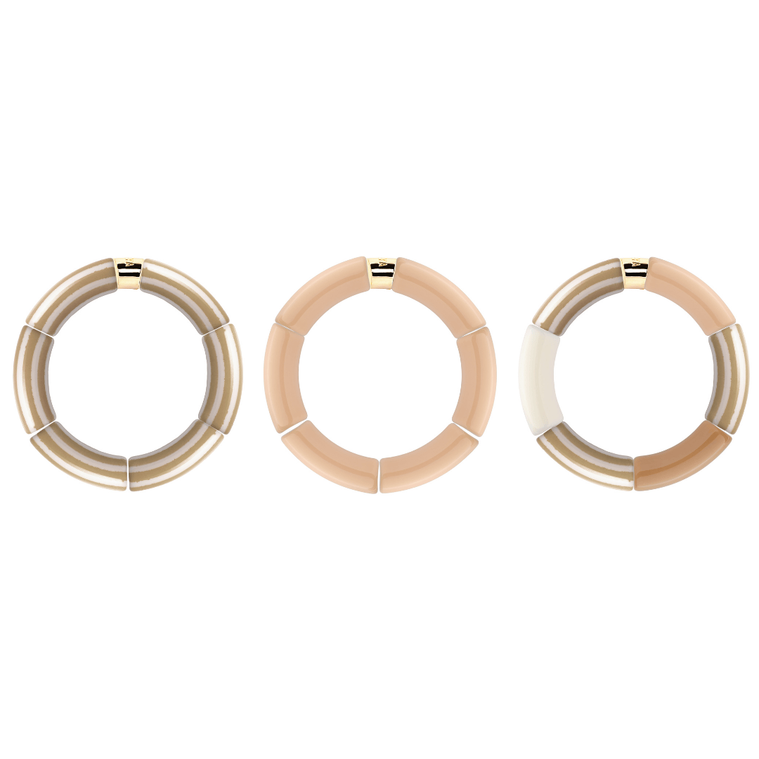 Les trios sont pensés selon un assemblage de couleurs travaillé, et la combinaison des 3 bracelets mis en valeur chacun des bracelets qui composent l'ensemble.