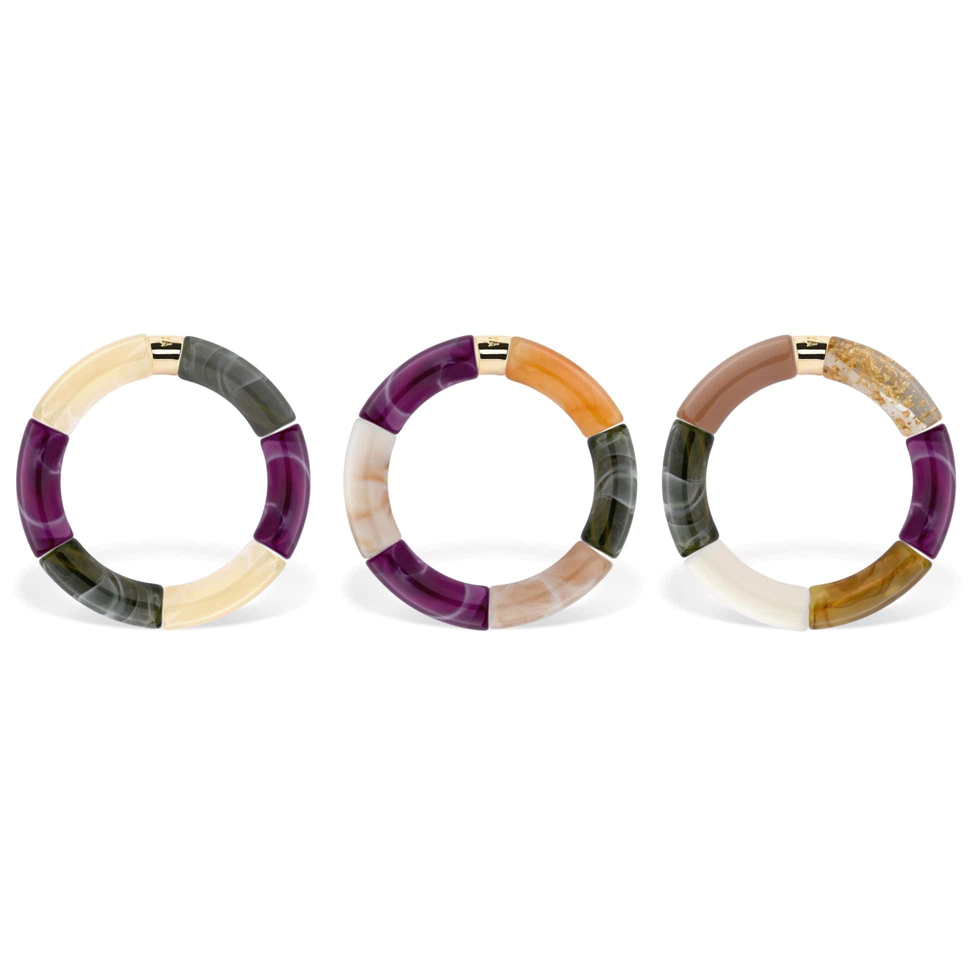 Les trios sont pensés selon un assemblage de couleurs travaillé, et la combinaison des 3 bracelets mis en valeur chacun des bracelets qui composent l'ensemble.